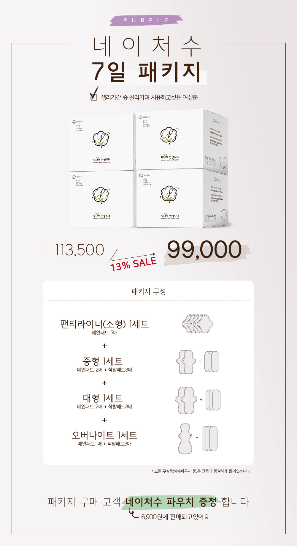 소형(팬티라이너5) 1세트 + 중형(2+3) 1세트 + 대형(2+3) 1세트 + 오버나이트(1+3) 1세트 + 파우치