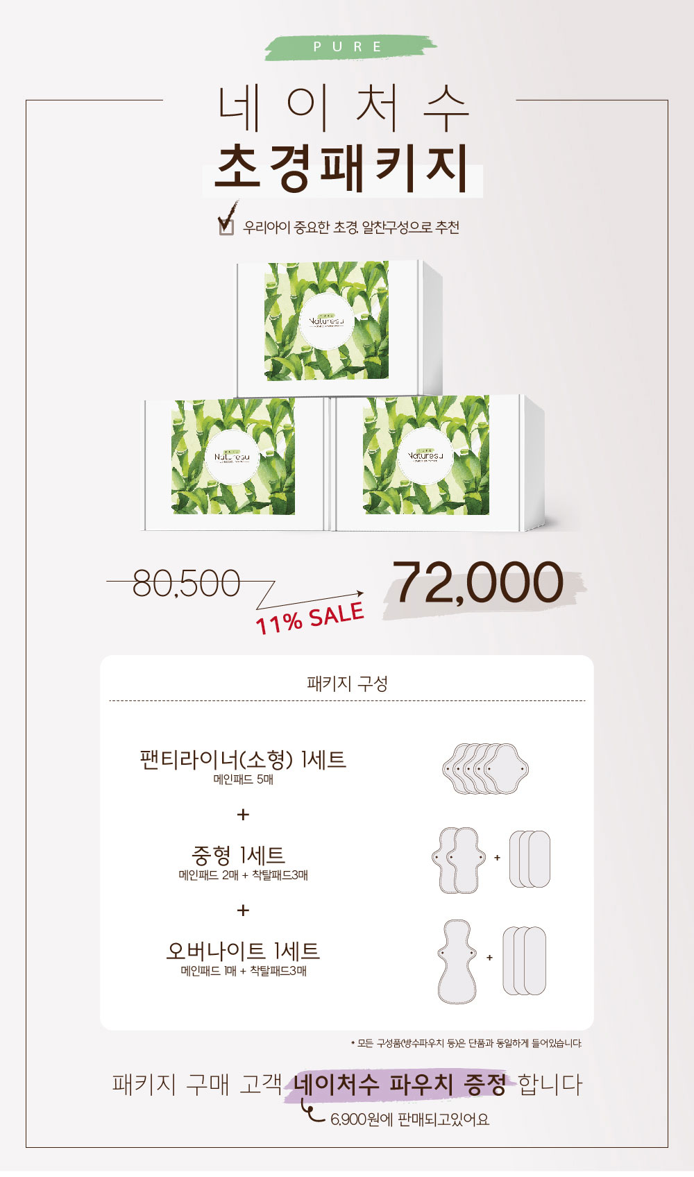 ● ● ● ● ● 소형(팬티라이너5) 1세트 + 중형(2+3) 1세트 + 오버나이트(1+3) 1세트 + 파우치